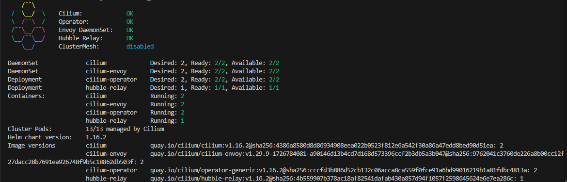cilium status --waitThis command will wait until Cilium is fully operational and report its status. The output should look as below: