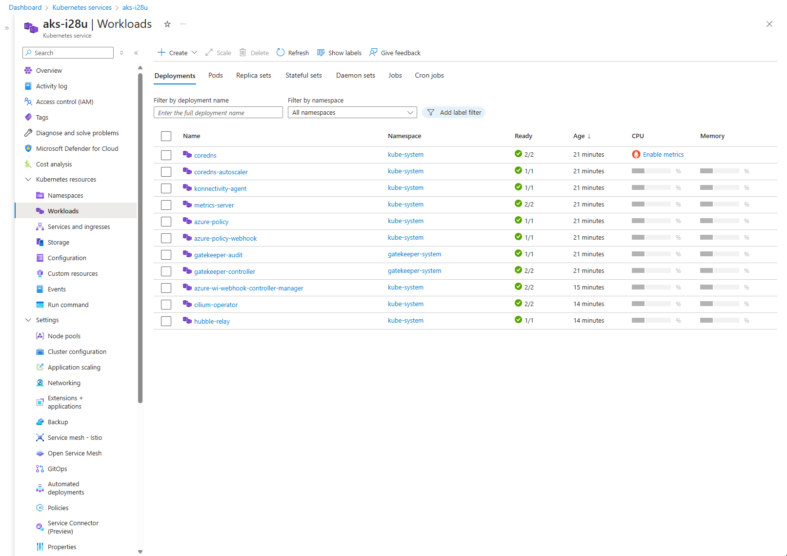 Now that the AKS cluster is up and running, we need to confirm that Cilium is installed correctly. To do this, you can examine the status of your workloads either through the Azure portal or by connecting directly to the cluster.
