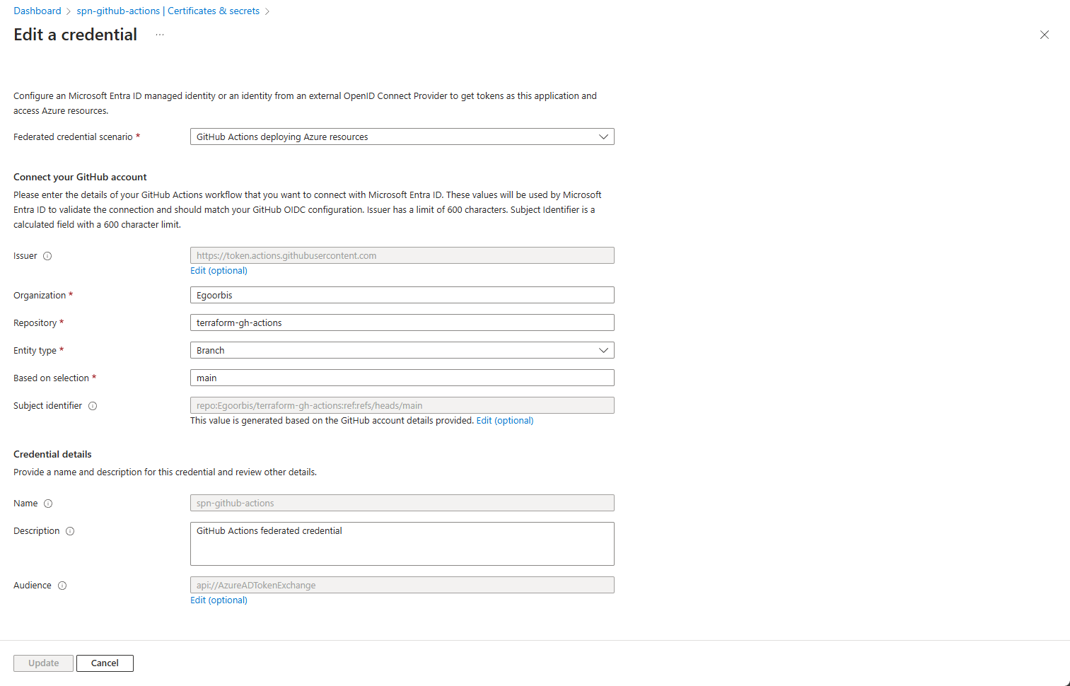 ## Add federated credential to Entra ID Application by pointing the subject to the main branch of the new respository created under your GitHub account