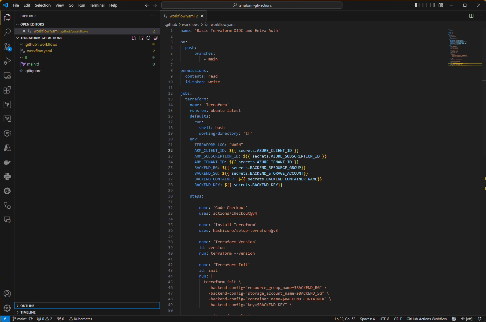 - Finally, we define the steps of our workflow by running the checkout, installing terraform and finally running through the common terraform init-plan-apply steps.