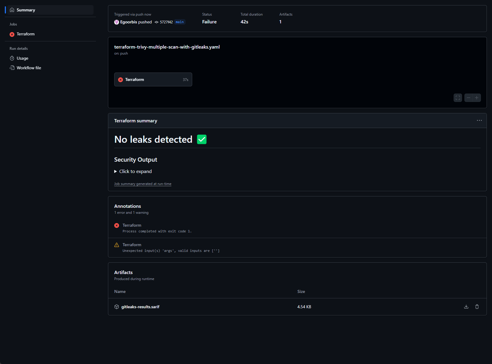 n this post, you’ll learn how to use Trivy in GitHub Actions to scan your Terraform code for vulnerabilities before deploying. While working on this, I found Trivy’s secret detection had some gaps, so I added GitLeaks to the mix